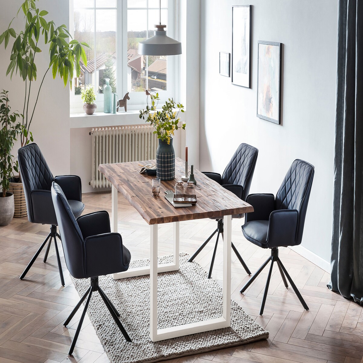 SalesFever Tischgruppe Akazie 180cm, 5-tlg., 35mm Platte natur |Metallgestell schwarz |Drehstühle Microfaser in Kunstlederoptik |dunkelblau–schwarz