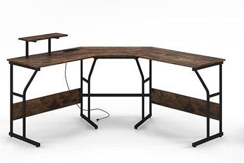 L-förmiger Computertisch mit Steckdose & CPU-Ständer & Robustem Metallrahmen Eckschreibtisch Braun