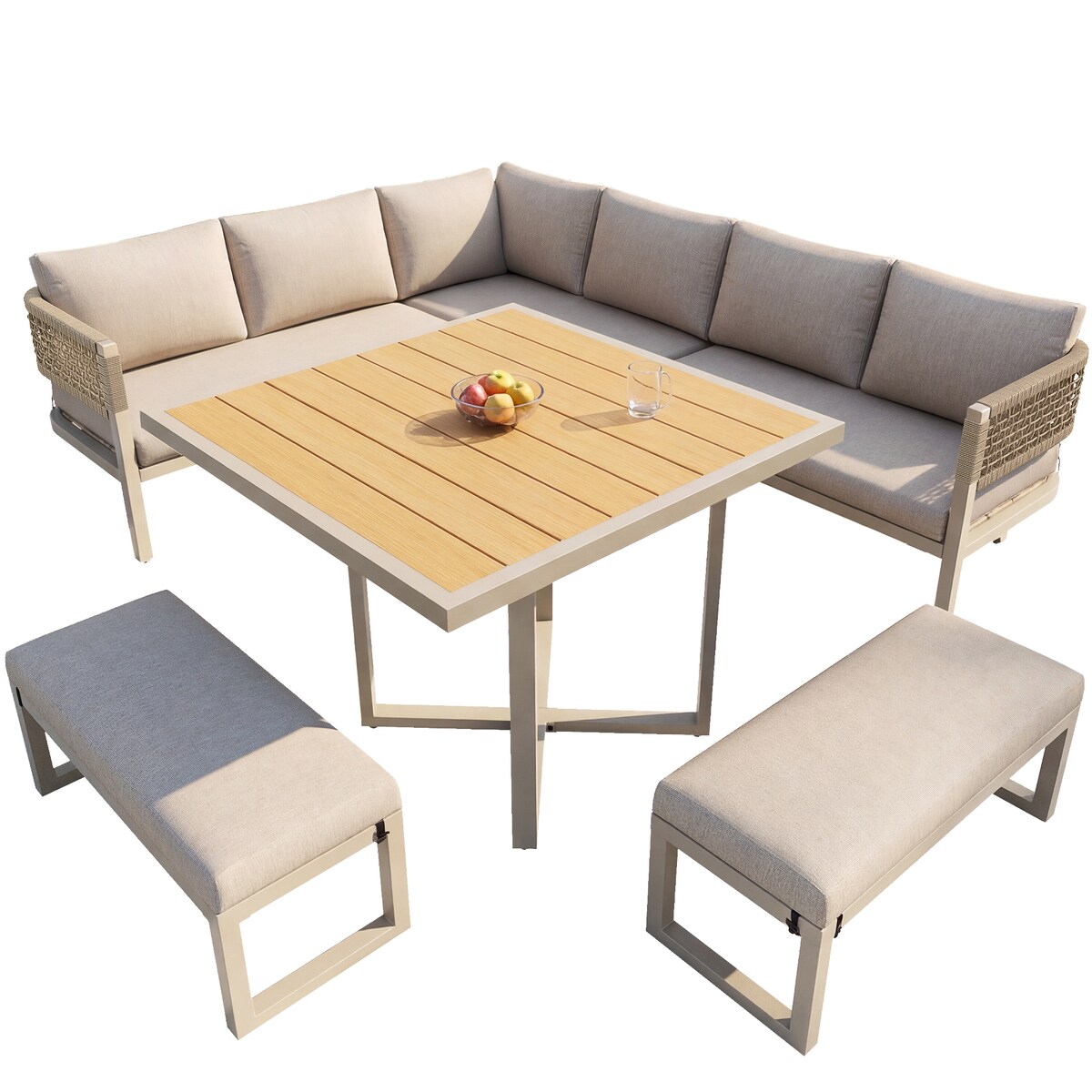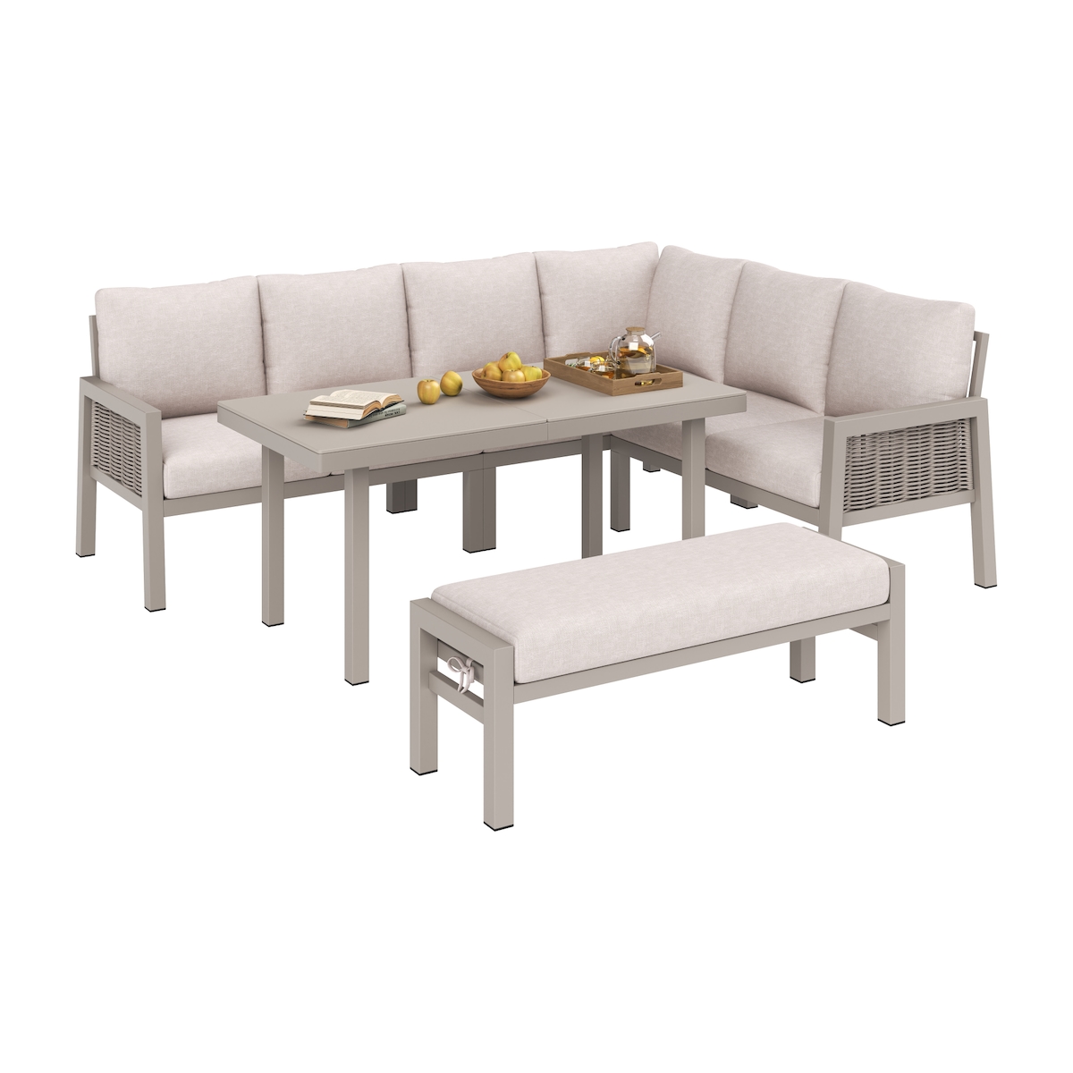 Merax Garten-Lounge-Set für 8-10 Personen, Gartensofa mit großem Esstisch aus Seilgeflecht, Beige