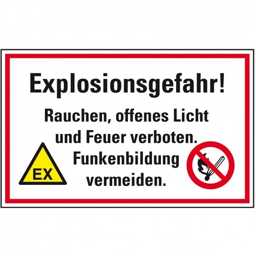 Schild I Hinweis-Kombischild Explosionsgefahr! Rauchen, offenes Licht und Feuer verboten, Kunststoff, 300x200mm