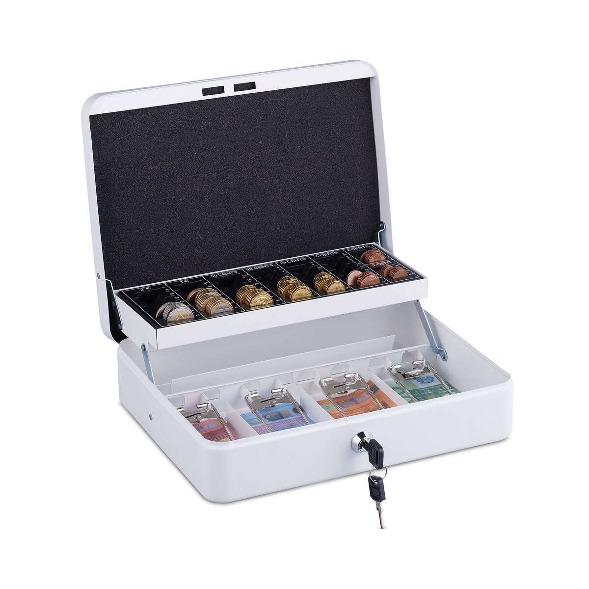 Relaxdays Geldkassette, abschließbar, Eisen, Münzzählbrett & 4 Scheinfächer, HBT: 8,5 x 30,5 x 24,5 cm, Kassa, weiß