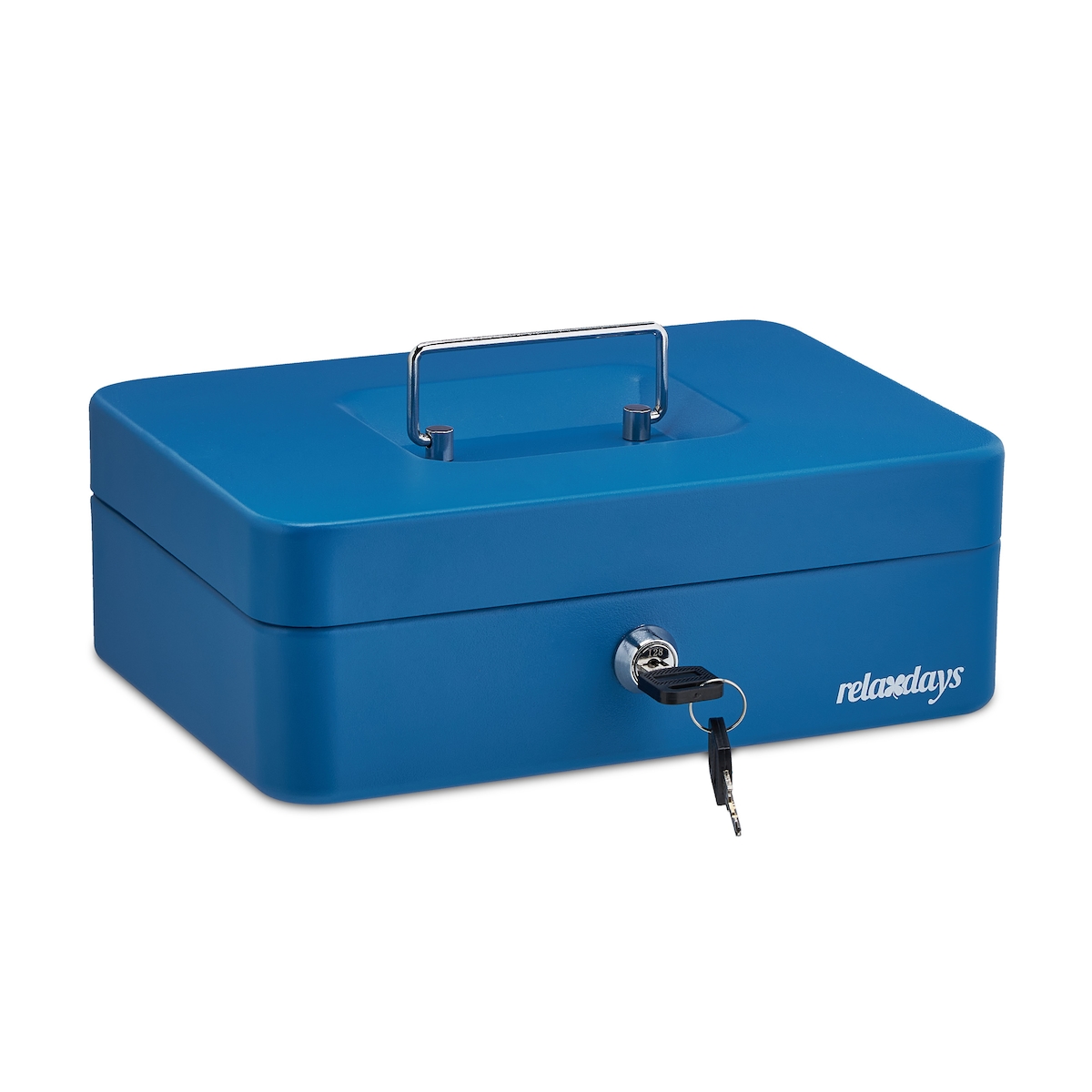 Relaxdays Geldkassette abschließbar, entnehmbarer Einsatz, 5 Fächer, Geldkasten Eisen, HxBxT: 8,5 x 20 x 17 cm, blau
