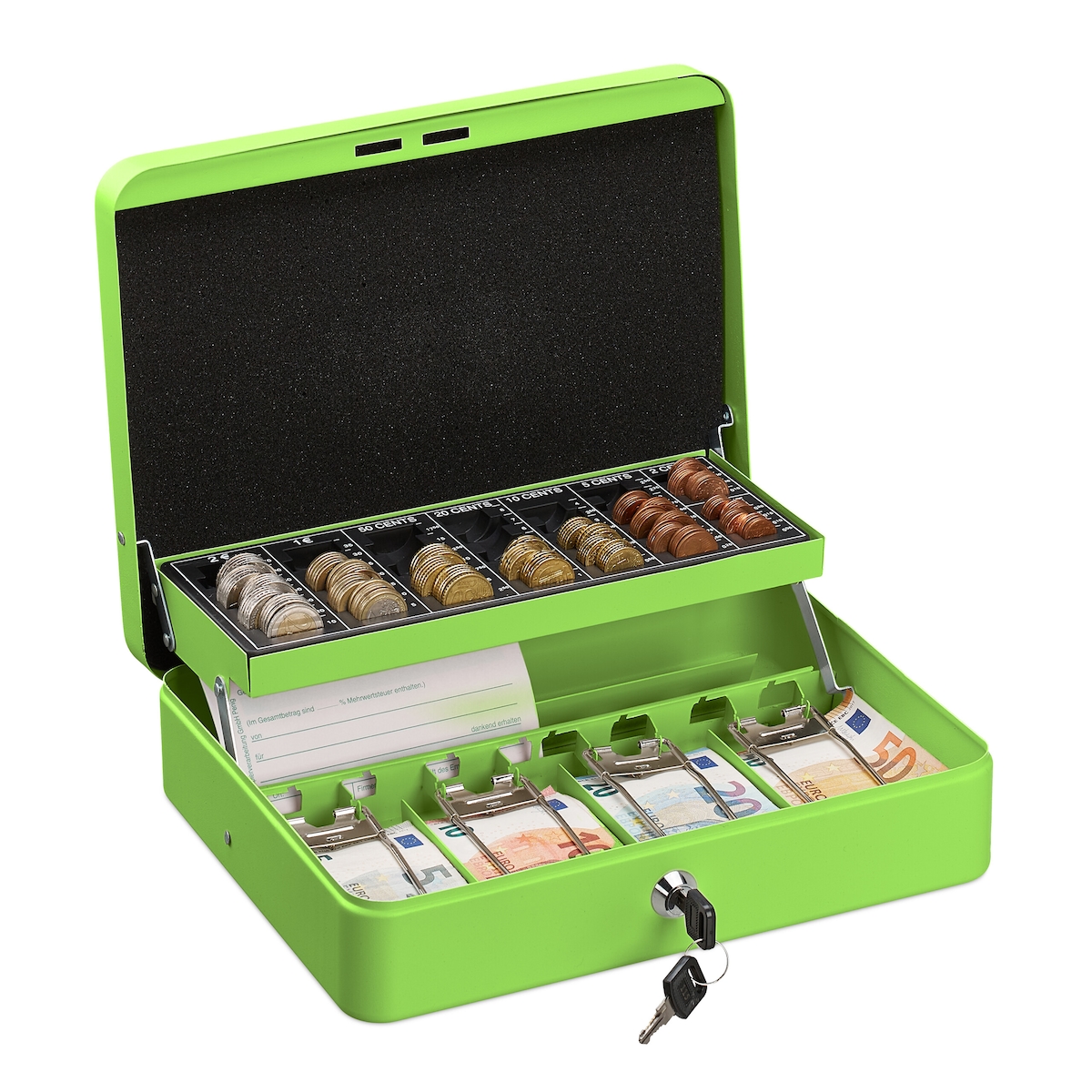 Relaxdays Geldkassette abschließbar, Münzzählbrett & 4 Scheinfächer, Geldkasse Eisen, HxBxT: 8,5 x 30,5 x 24,5 cm, grün