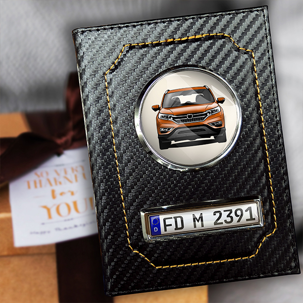 Personalisierte Fahrzeugscheinhülle als Geschenk für Männer: lass sein Nummernschild, Auto bzw. Wunschfoto abbilden. Geschenkideen für Männer