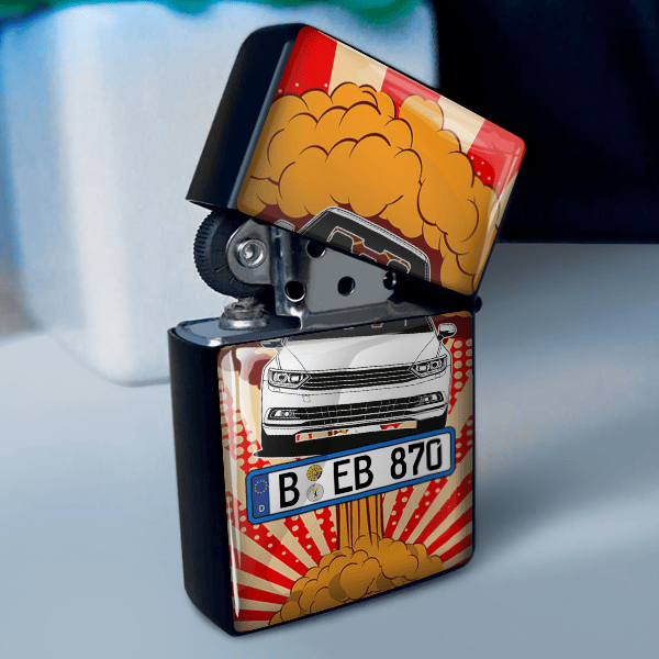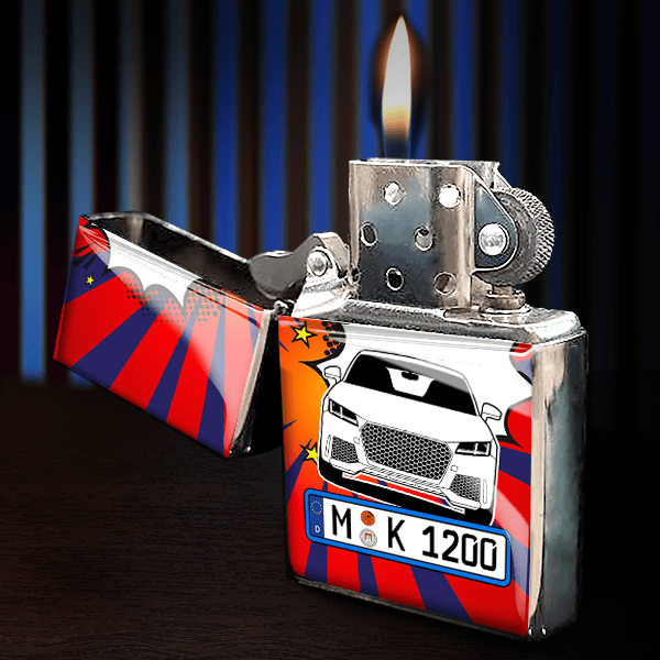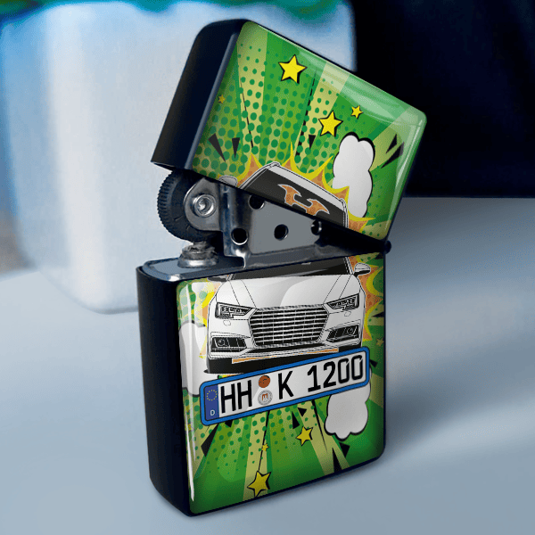 Personalisiertes Feuerzeug – Besondere Geschenkideen für Männer, individuell gestaltetes Feuerzeug mit eigenem Auto-Modell und Kennzeichen.