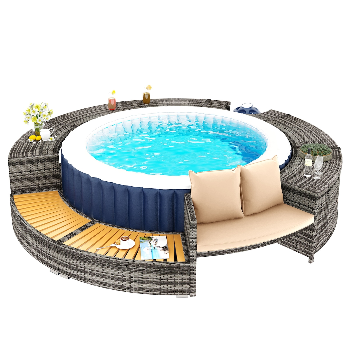 Merax Spa-Pool, Gartenmöbel-Set, Poolumrandung, PE-graues Rattan und Akazienholz, mit Stauraum, Lounge-Set, für Whirlpool und Pool