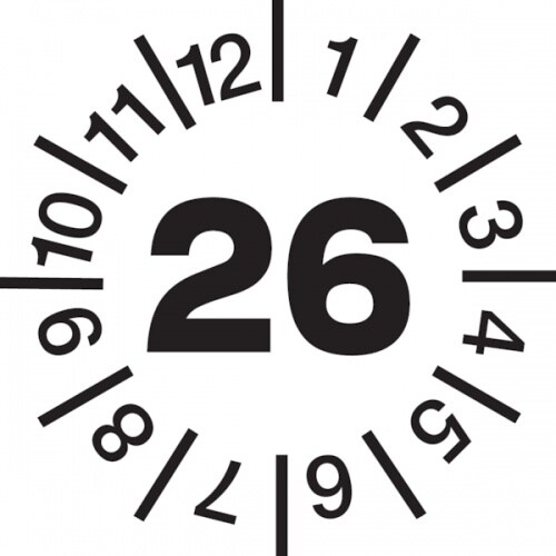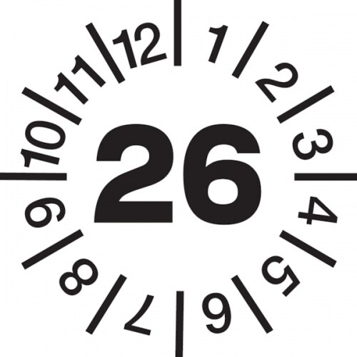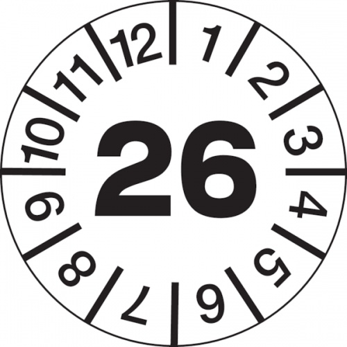 König Werbeanlagen Jahresprüfplaketten ab 26, 2-farbig 2 Jahreszahlen, Folie, Ø 30 mm - Bogen = 10 Plaketten - 30 mm Folie selbstklebend