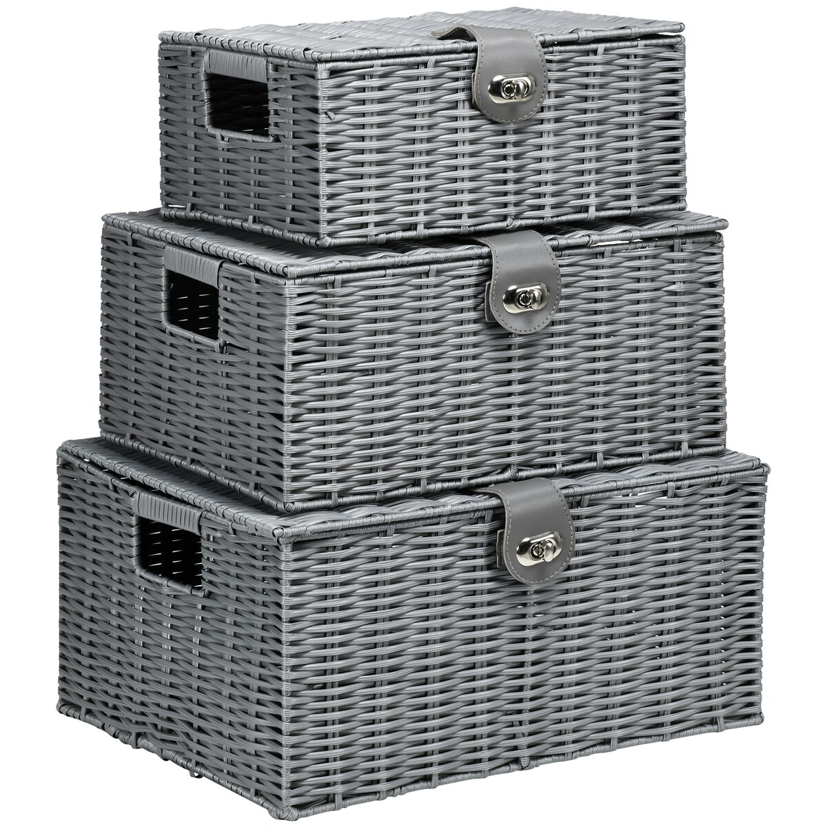 STILVORA Aufbewahrungsboxen 3er-Set 35x28x18 cm mit Deckel & Schnallen, geflochtene Körbe PP Kunststoff Metallrahmen, Ordnungssystem Zuhause, Grau