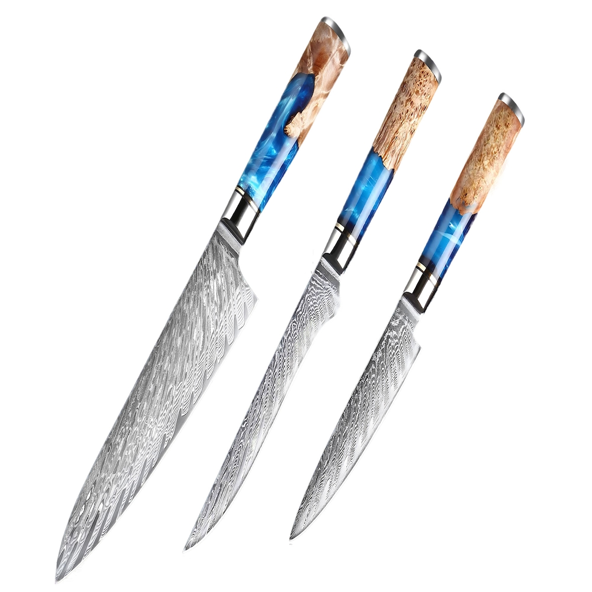 Wakoli Nitoko 3er Kiritsuke Damastmesser-Set - Profi Damast-Küchenmesser Set aus echtem 67 Lagen Damaststahl mit G10 Griff, durchgehender Erl - Inklus