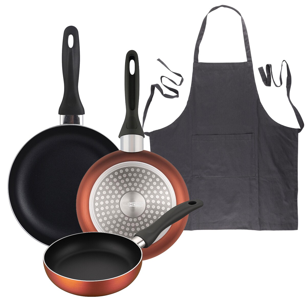 BERGNER - Set aus 3 Pfannen Ø16/20/24cm aus gepresstem Aluminium in metallic-copper mit Küchenschürze Dunkelgrau 100 % Baumwolle 75x80 cm