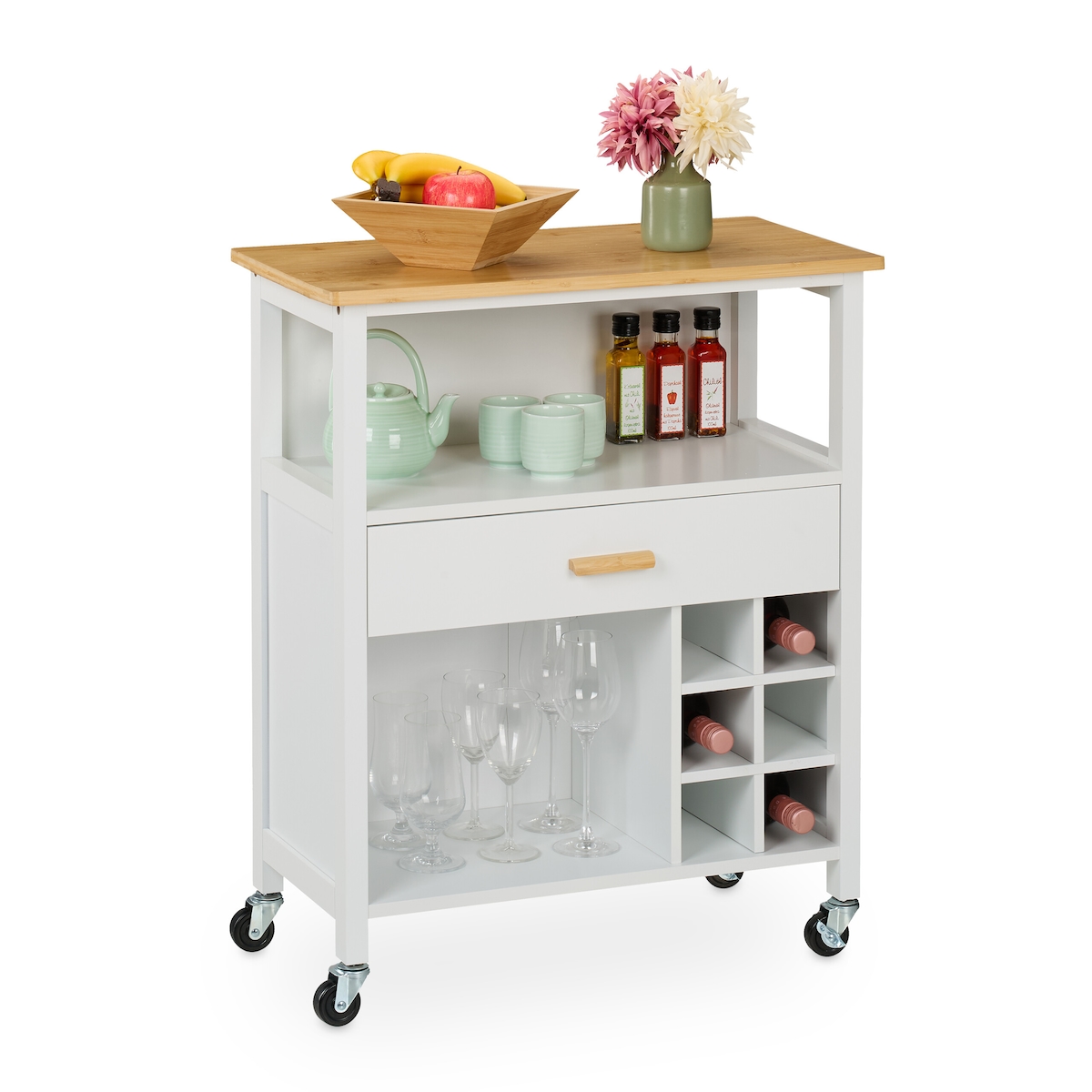 Relaxdays Küchenwagen, Weinregal für 6 Flaschen, Schublade, 2 Fächer, 80x65x35 cm, Bambus Arbeitsplatte, MDF, weiß/natur