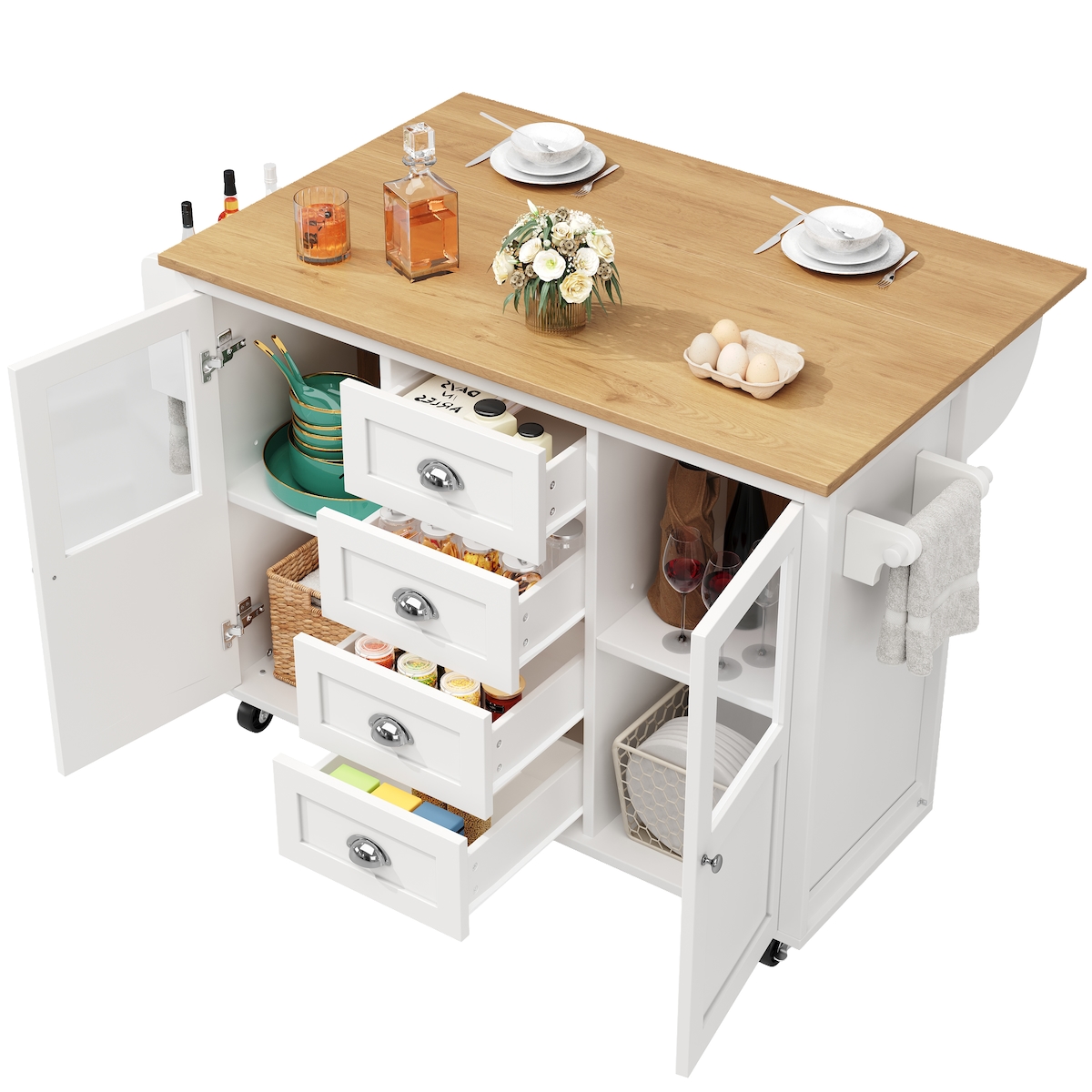 STILVORA Kücheninsel Küchenwagen 138x73x93 Weiß mit Klapptisch Rollen vier Schubladen zwei Türen Glasfach verstellbaren Einlegeböden Handtuchhalter