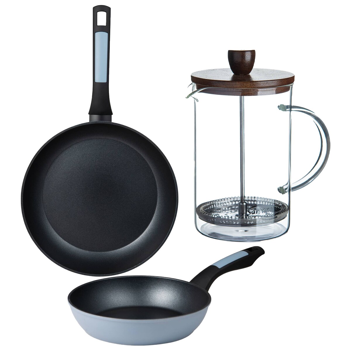 BERGNER - Set aus 2 Pfannen Ø20/26 cm aus gepresstem Aluminium für Induktion geeignet mit French Press Kaffeebereiter Borosilikatglas 15,8×10×18,8cm