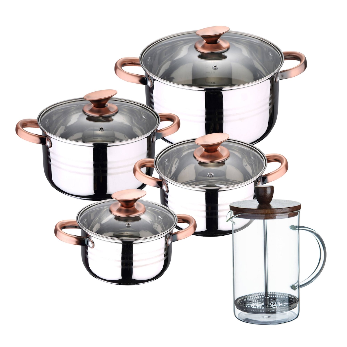 BERGNER - NONA 8-teiliges Kochgeschirr-Set (16/18/20/24cm) aus Edelstahl, induktionsgeeignet, mit Kaffeebereiter aus Borosilikatglas (15,8×10×18,8cm)