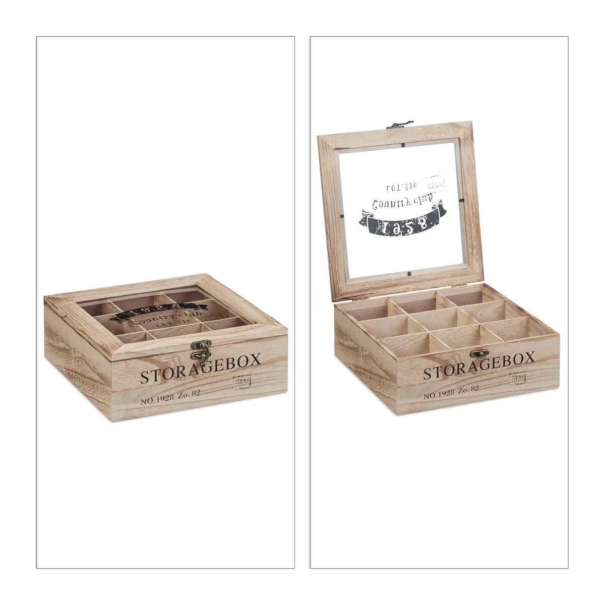 Relaxdays Teebox, 9 Fächer, Holz, Teekiste mit Sichtfenster, Teebeutel, Kaffeepads, Gewürze, HBT: 9 x 24 x 25 cm, natur