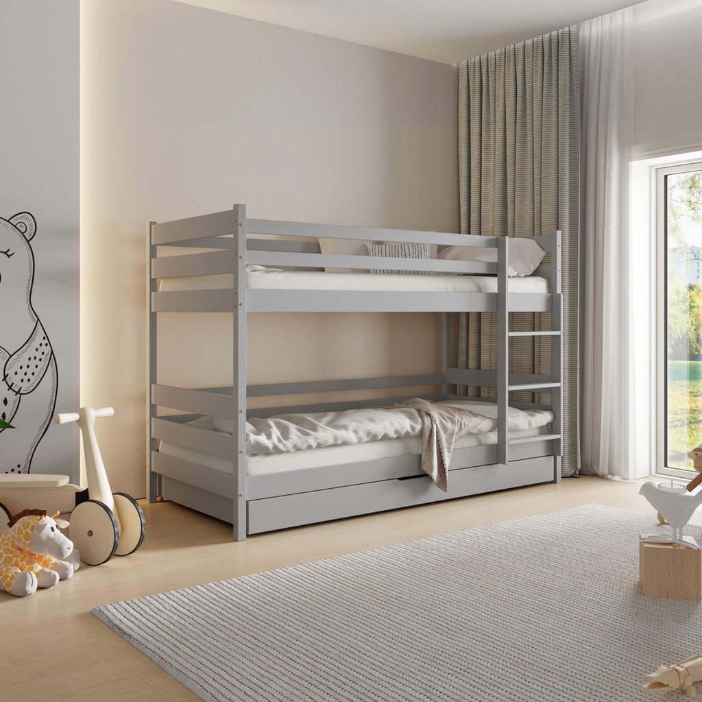 Masseno Etagenbett SIMBA 80x160 cm mit Schublade, Rausfallschutz, Kinderbett mit Leiter für Mädchen und Jungs, Stockbett 2 Kinder, Holz, Hellgrau