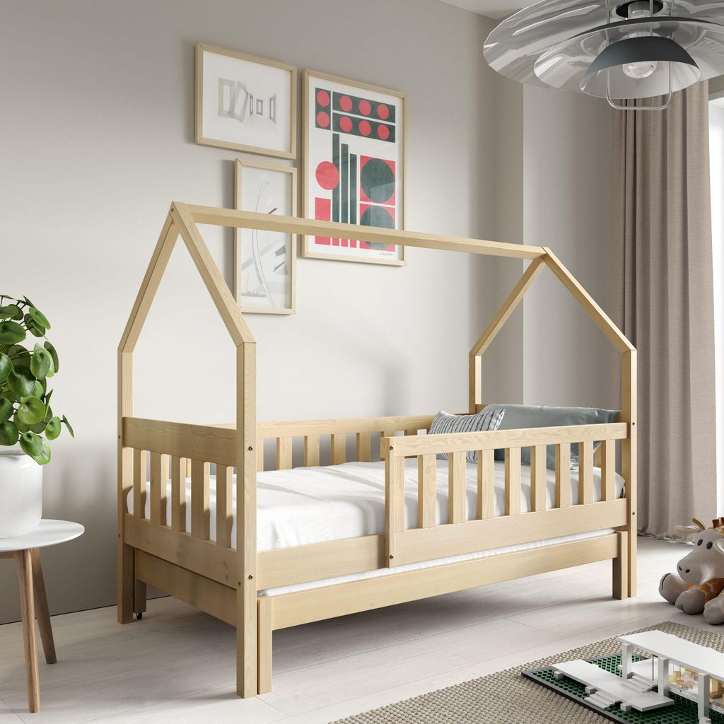 Masseno Kinderbett BAMBINA 80x160 cm mit Rausfallschutz, Einzelbett für Mädchen und Jungs, Hausbett für Kinder, Kiefernholz