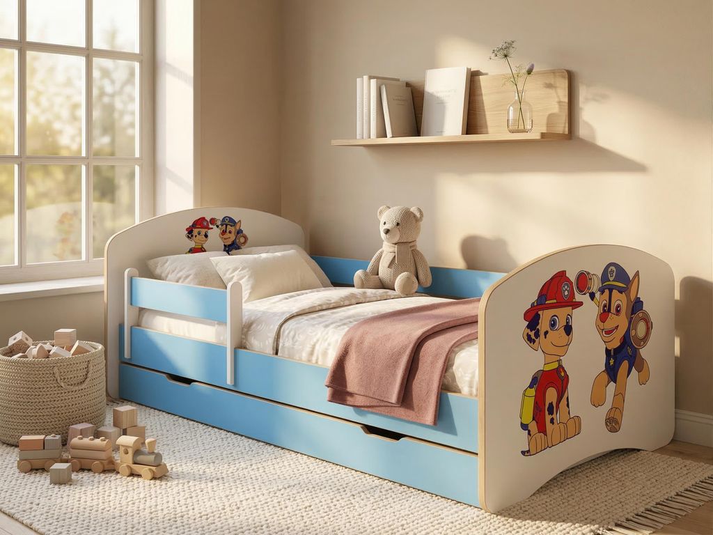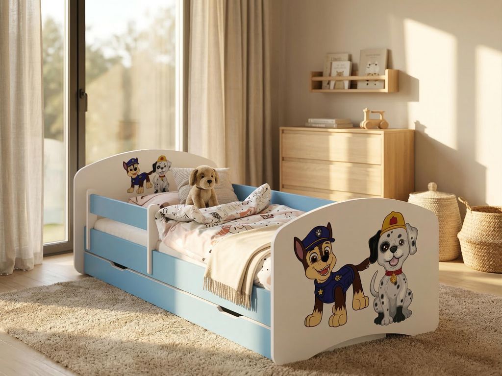 1x Happy Babies Kinderbett mit Rausfallschutz Junge 140x70 Bett für Kinderzimmer mit Schublade Matratze Einzelbett für Kinder Weiß Blau Hundemotiv