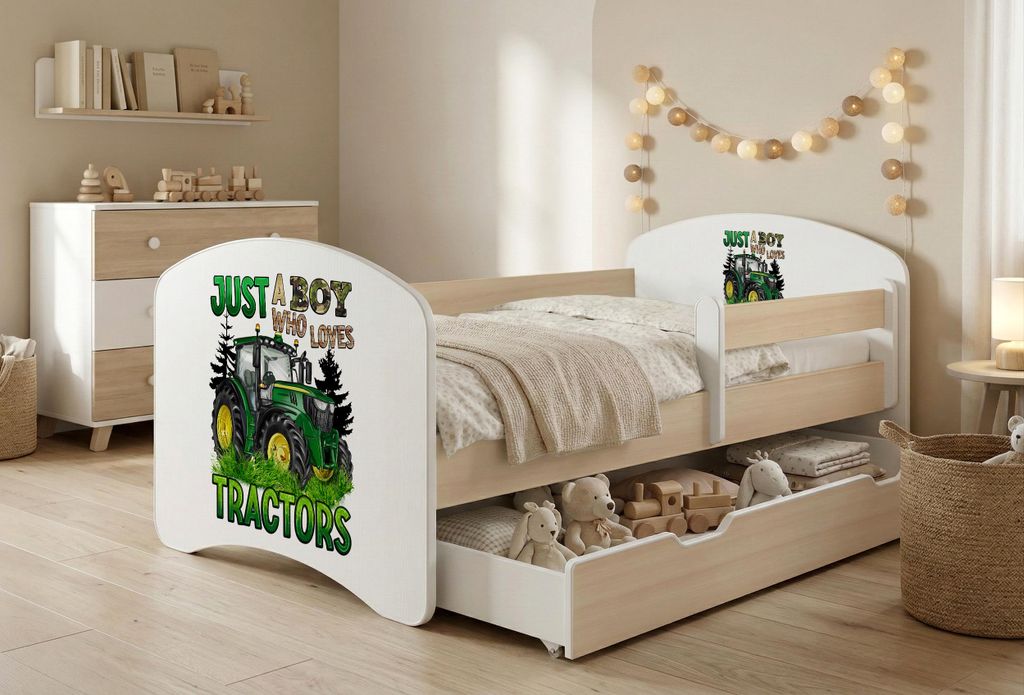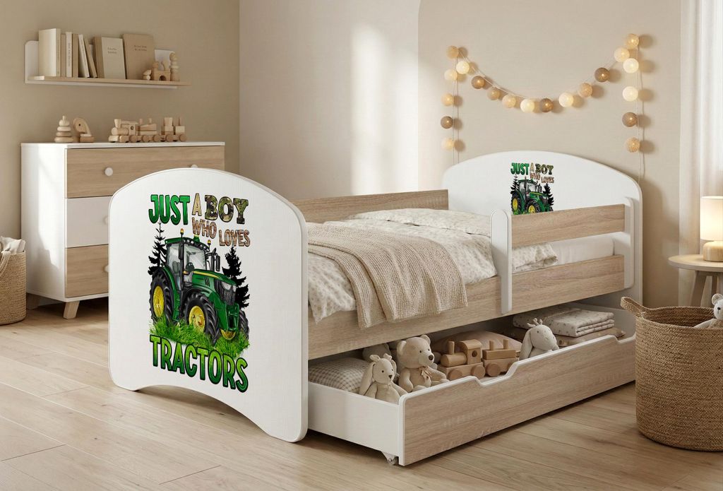Happy Babies Kinderbett mit Rausfallschutz Junge 140x70 Bett für Kinderzimmer mit Schublade Matratze Einzelbett für Kinder Sonoma-Eiche,Traktor
