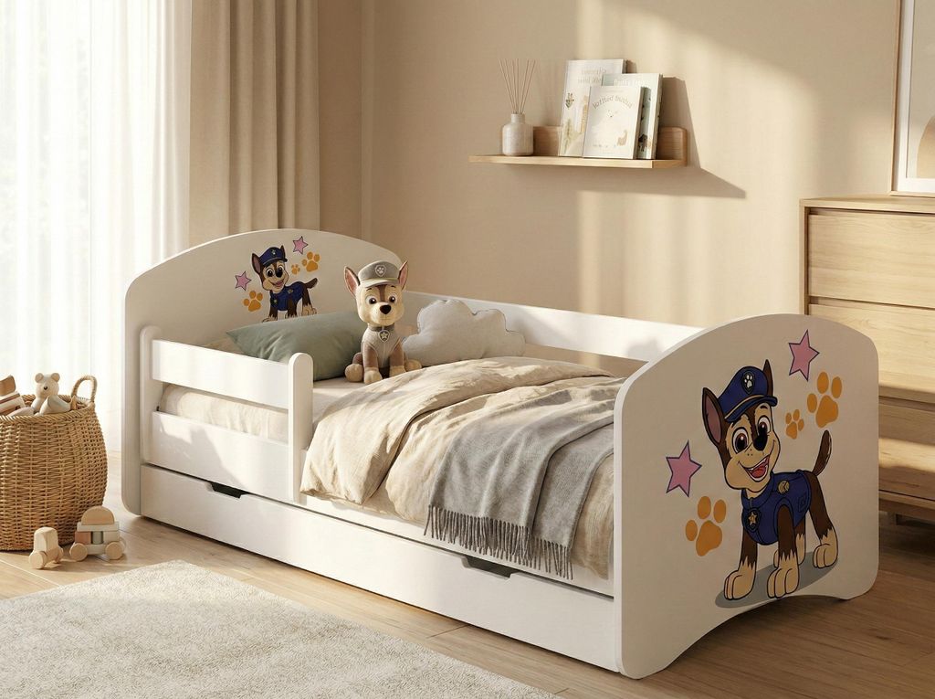 1x Happy Babies Kinderbett mit Rausfallschutz Junge 140x70 Bett für Kinderzimmer mit Schublade Matratze Einzelbett für Kinder Weiß Hundemotiv