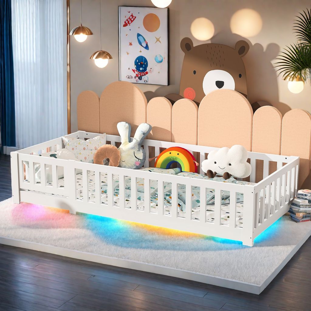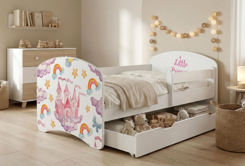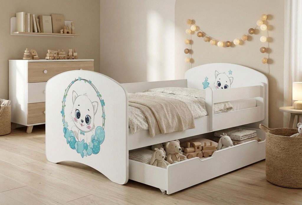 Happy Babies Kinderbett - mit Rausfallschutz Junge 140x70 Bett für Kinderzimmer mit Schublade & Matratze Einzelbett für Kinder Eigene Grafik - Weiss