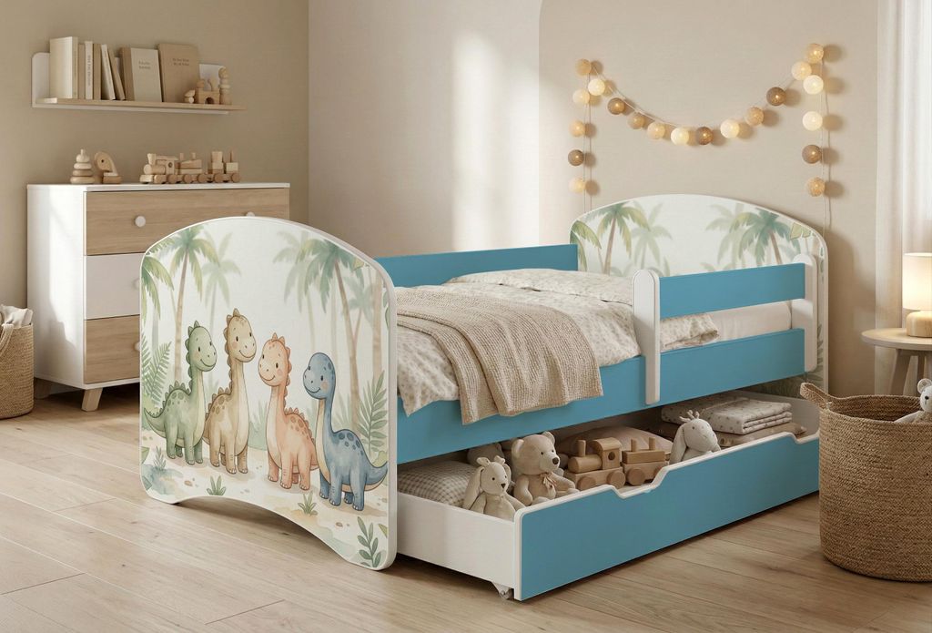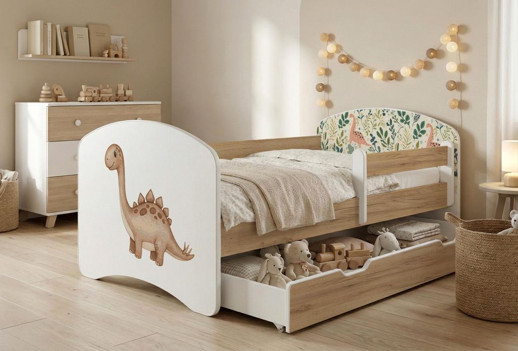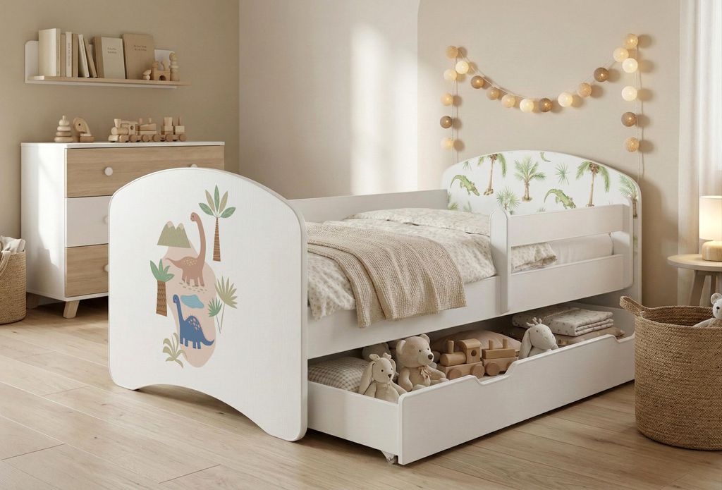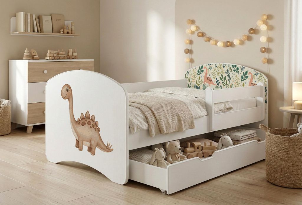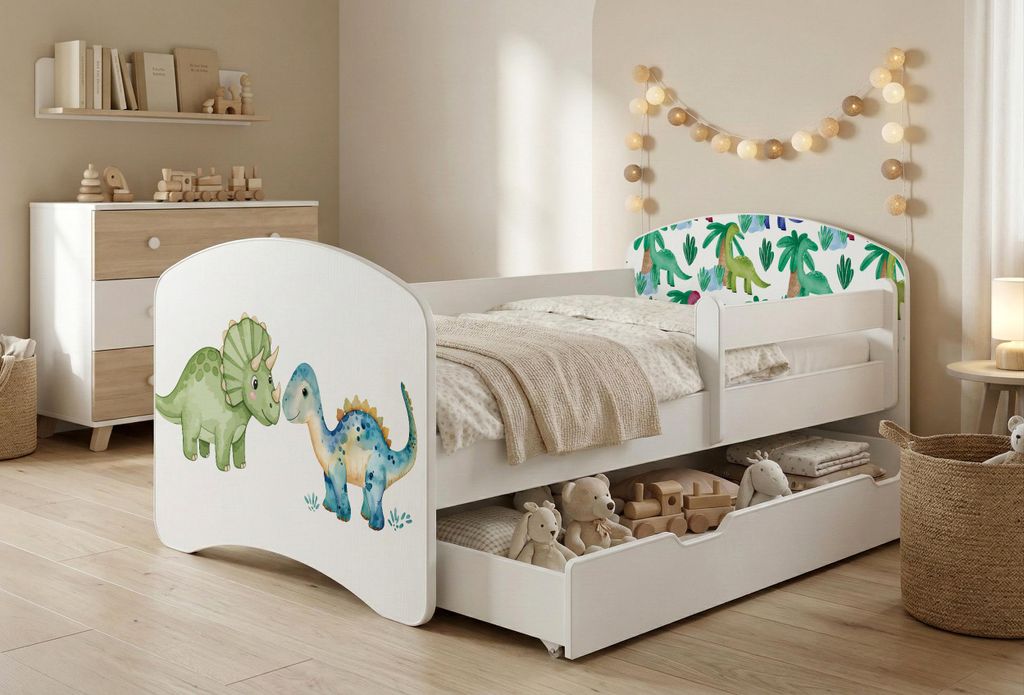 Happy Babies Kinderbett mit Rausfallschutz Junge 140x70 Bett für Kinderzimmer mit Schublade Matratze Einzelbett für Kinder Weiss, Dinosaurier