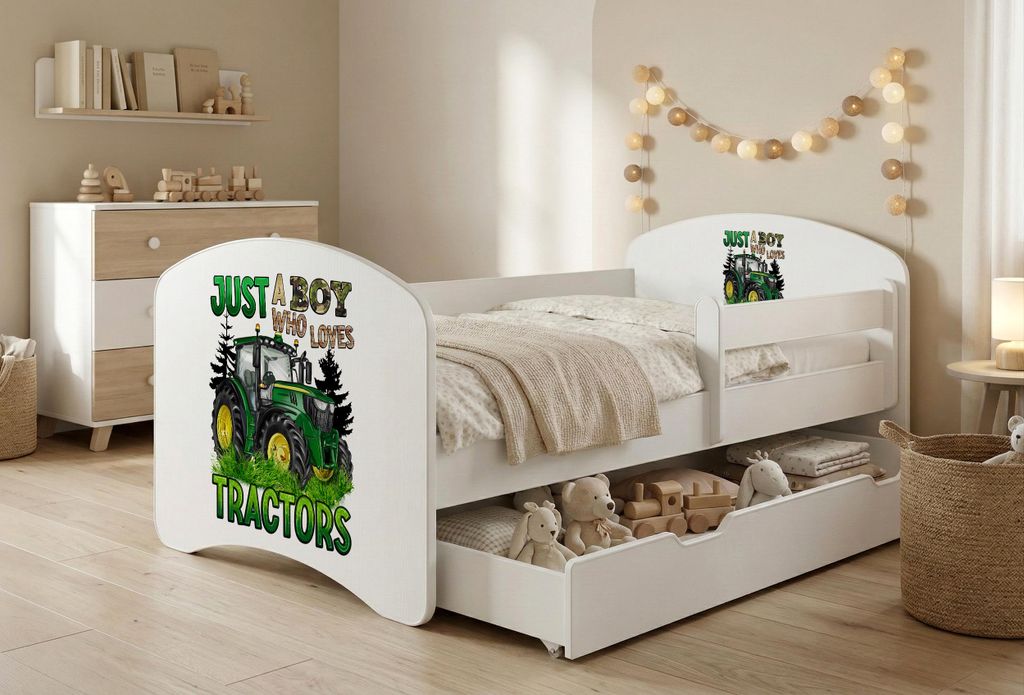 Happy Babies Kinderbett mit Rausfallschutz Junge 140x70 Bett für Kinderzimmer mit Schublade Matratze Einzelbett für Kinder, Heller Birnbaum, Traktor