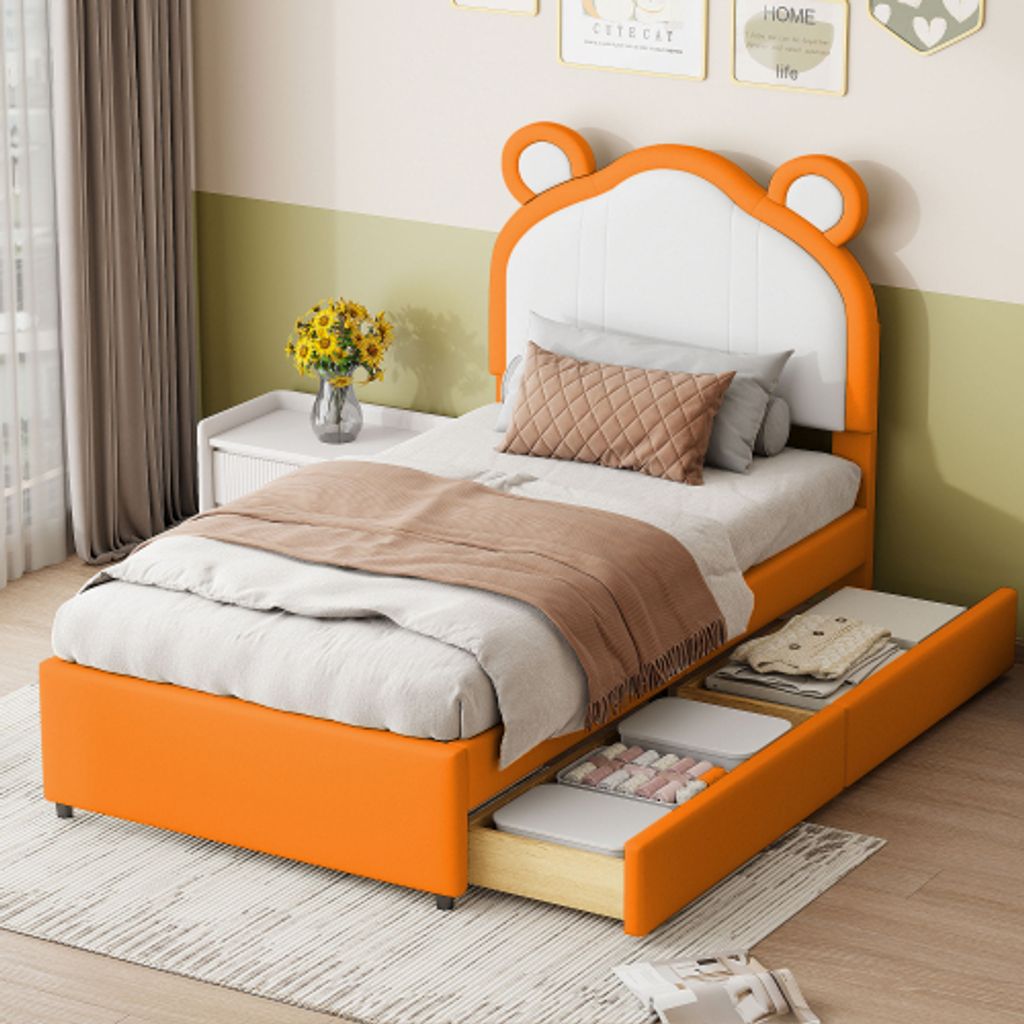 Polsterbett Kinderbett, 90*200 cm, zweifarbiges Patchwork am Kopfende des Bettes mit niedlichen Ohrformen, mit Ablagefächern, Einzelbett für Jung...