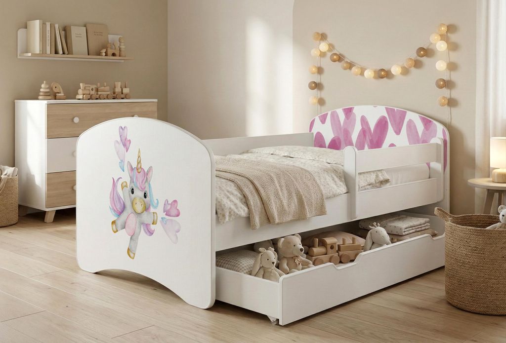 Kinderbett Jugendbett 80x180 cm Weiß mit Matratze Rausfallschutz Schublade und Lattenrost Kinderbetten für Mädchen und Junge - Einhorn