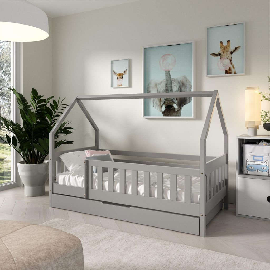 Masseno Kinderbett BELLA 80x190 cm mit Schublade, Rausfallschutz, Einzelbett für Mädchen und Jungs, Hausbett für Kinder, Holz, Hellgrau