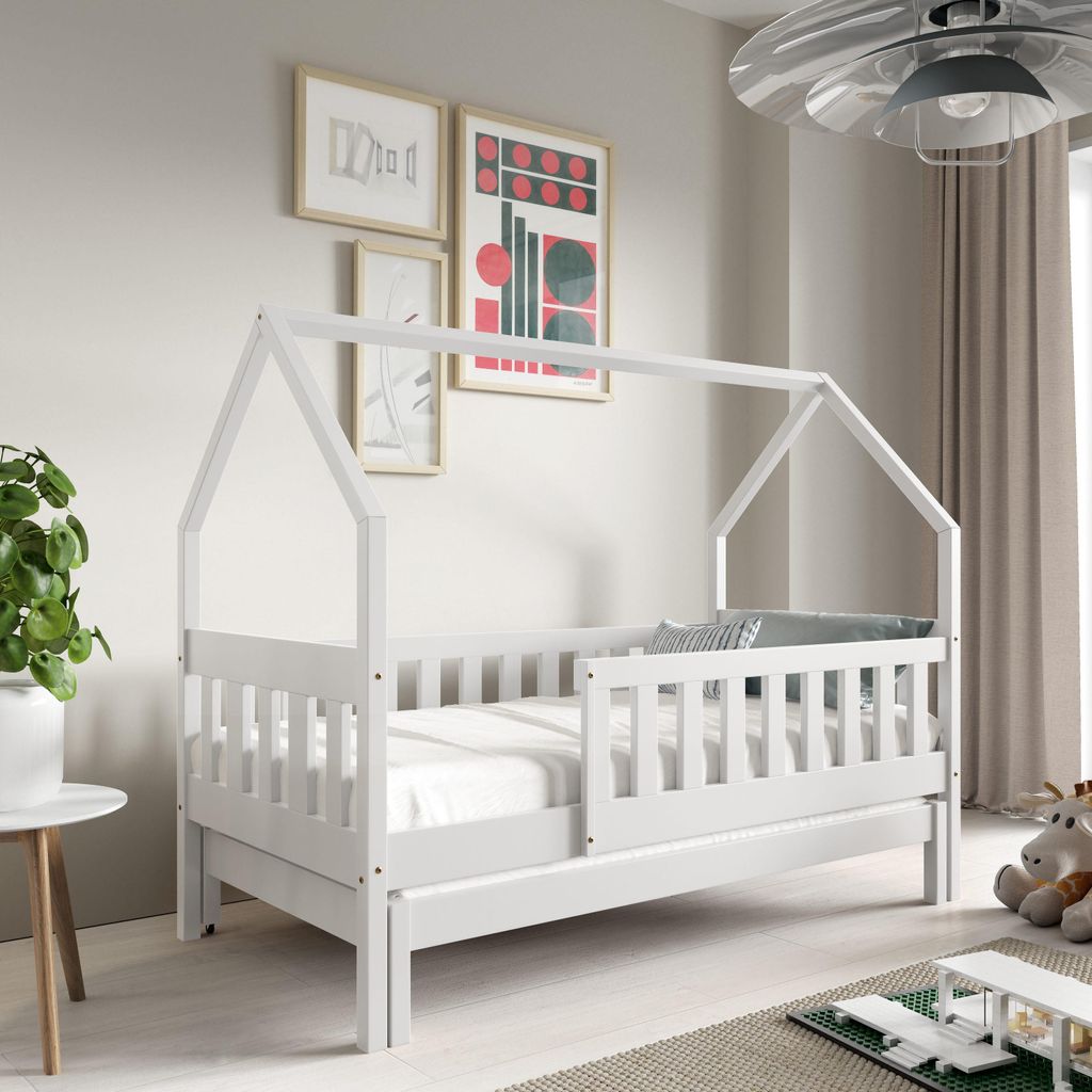 Masseno Kinderbett BELLA 80x160 cm mit Rausfallschutz, Einzelbett für Mädchen und Jungs, Hausbett für Kinder, Holz, Weiß