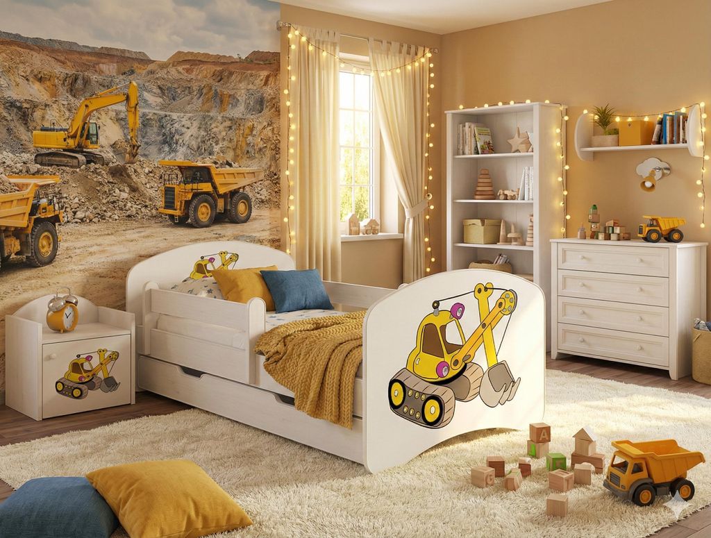 Happy Babies Kinderbett mit Rausfallschutz Junge 140x70 Bett für Kinderzimmer mit Schublade Matratze Einzelbett für Kinder Weiss, Bagger Motiv
