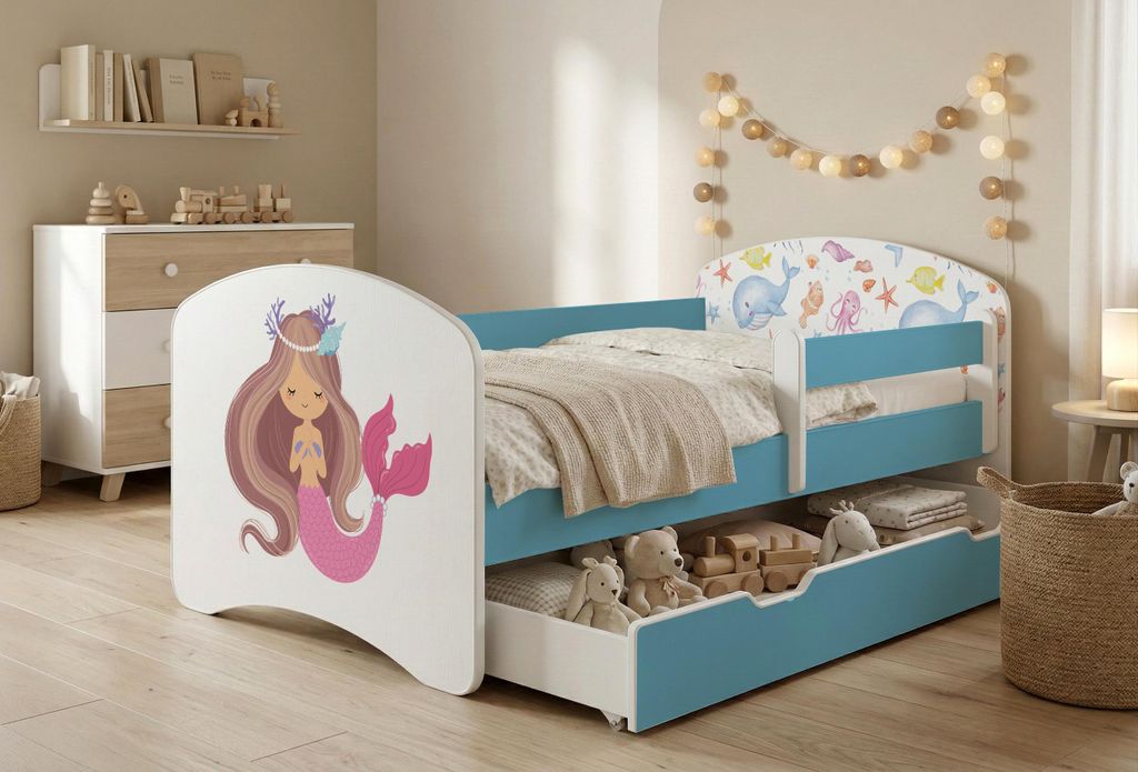 Happy Babies Kinderbett mit Rausfallschutz Junge 140x70 Bett für Kinderzimmer mit Schublade Matratze Einzelbett für Kinder, Blau, Bunte Aufkleber