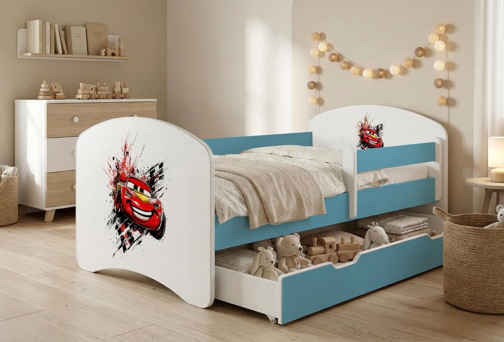 1x Happy Babies Kinderbett mit Rausfallschutz Junge 160x80 Bett für Kinderzimmer mit Schublade Matratze Einzelbett für Kinder Weiß Blau Auto BETT