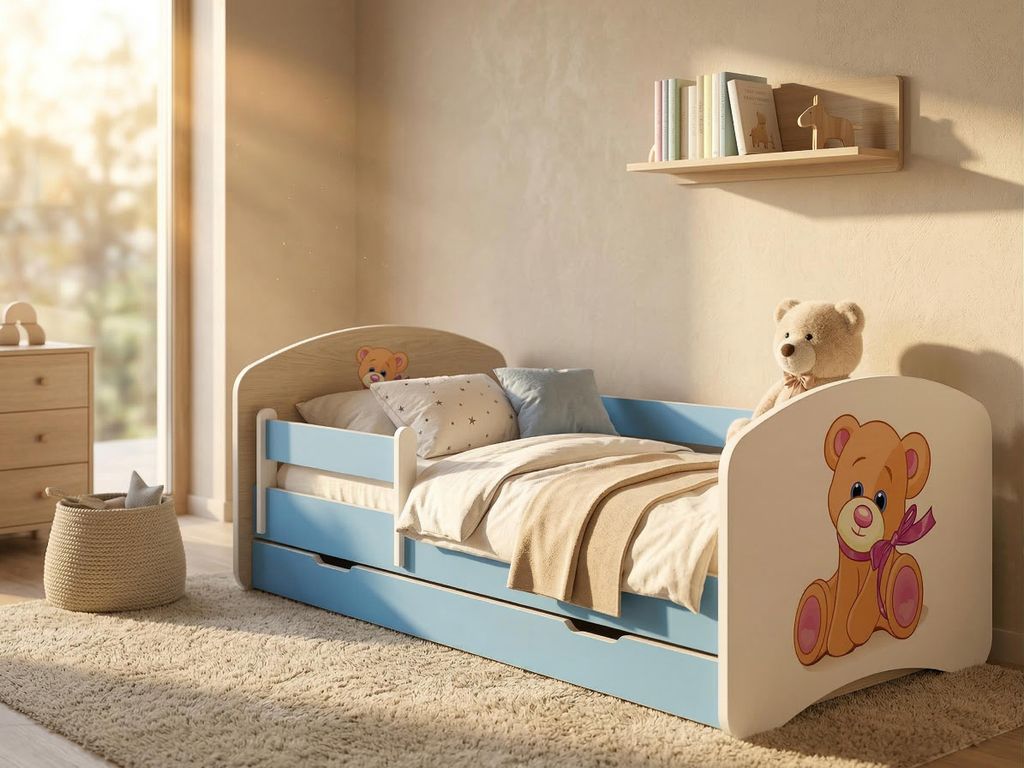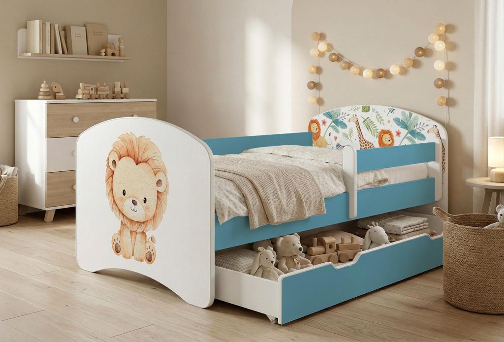 Happy Babies Kinderbett mit Rausfallschutz Junge 140x70 Bett für Kinderzimmer mit Schublade Matratze Einzelbett für Kinder Blau, Bär