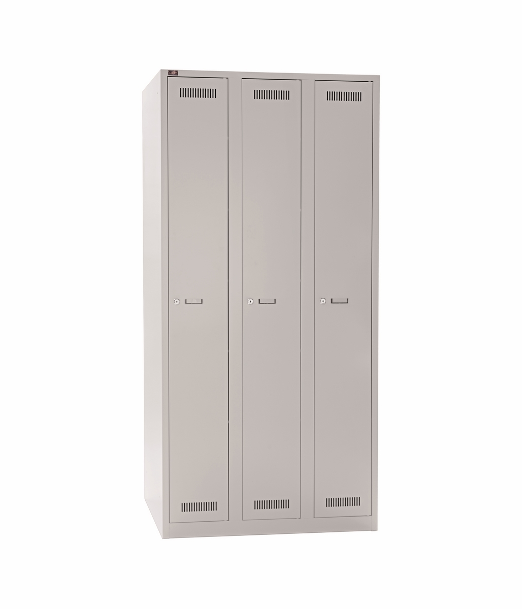 BISLEY Garderobenschrank Light abschließbar mit Belüftungslöchern, Hutboden, Handtuchhalter, Kleiderstange & 3 Haken - Spind mit Schloss in lichtgrau