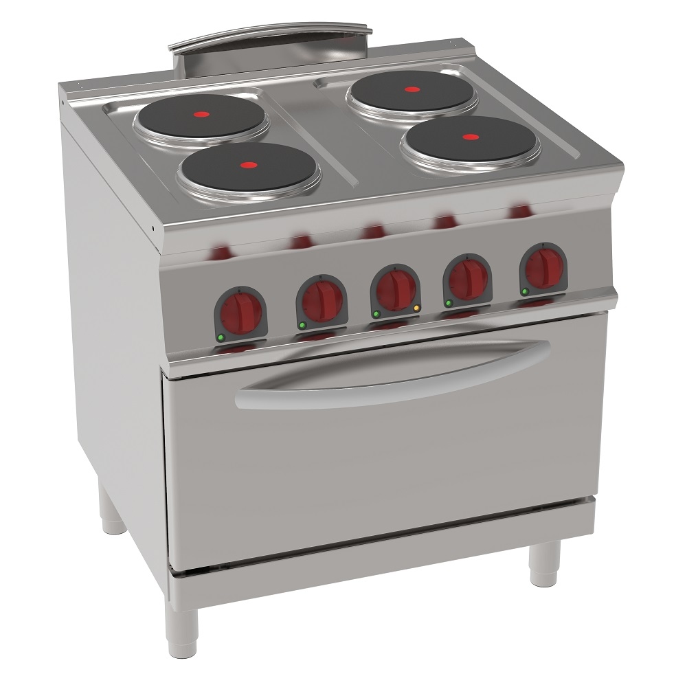 Professioneller Elektroherd mit 4 Kochplatten und Elektrobackofen mit Umluft GN1/1, Tiefe 700 mm
