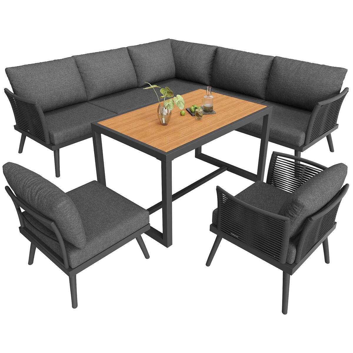 Merax Modulares Gartenmöbel Set 7-Sitzer mit Seilgeflecht, 6-tlg. L-Sofa, Sessel & Tisch, mit Kissen, Grau