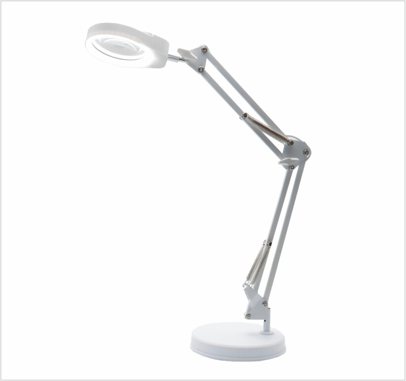 Papuq LED-Lampe mit Vergrößerungslupe X5 Ø95mm weiß, Licht regulierbar in 3 Stufen, Schwenkarm 60cm, stabile Basis und Metallklemme.