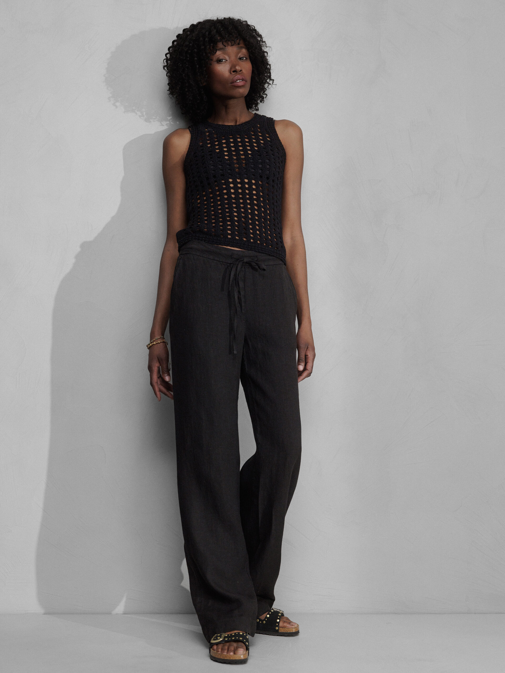 ASKSA Damen Leinenhose Casual Leicht Leinen Hose Gerades Bein Palazzo Freizeithose Einfarbig Hohle Sommerhose (Schwarz,S)