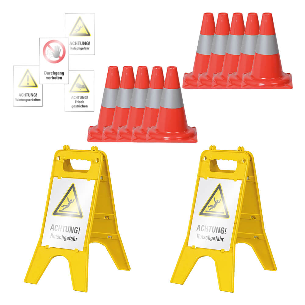 Absperr-Kombi-Set, 10 Leitkegel in Rot/Silber mit 2 Warnaufstellern