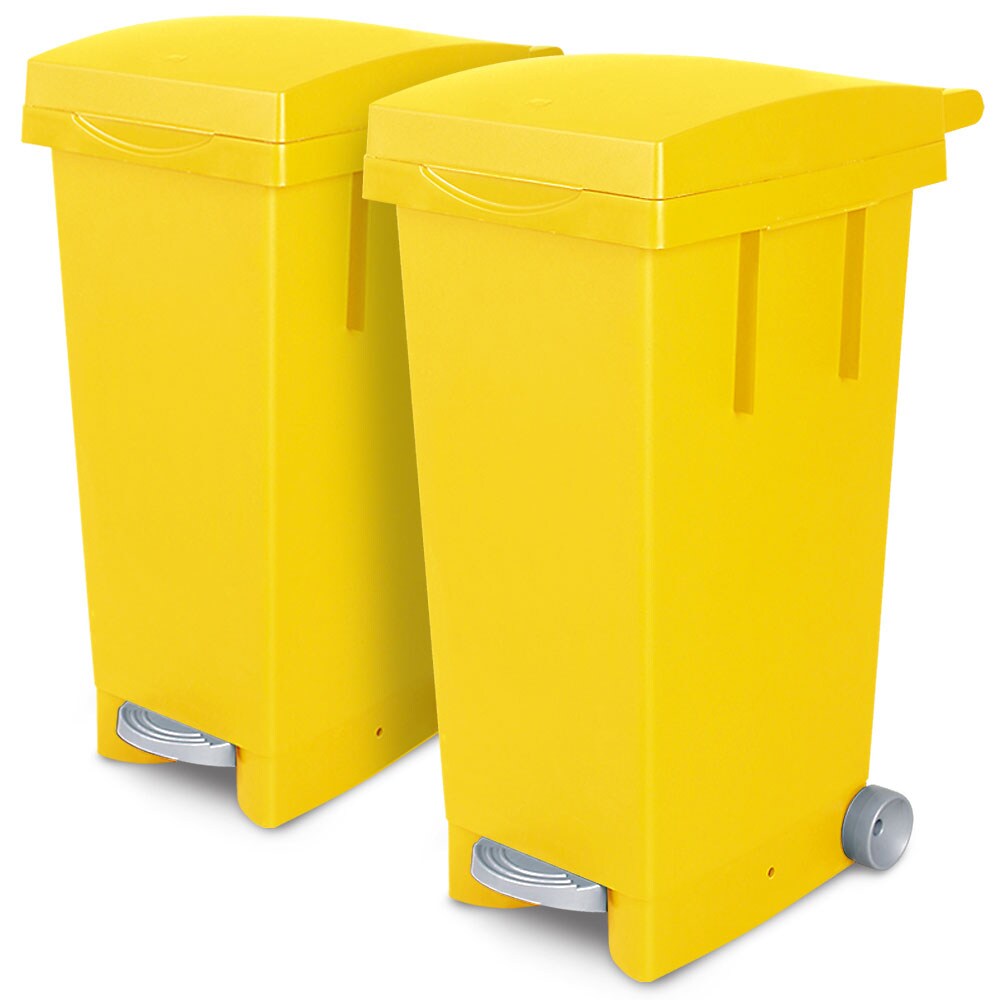 BRB 2X 80 Liter Abfallbehälter mit Rollen, gelb, Fußpedal, selbstschließender Deckel, Klemmring für Müllsäcke