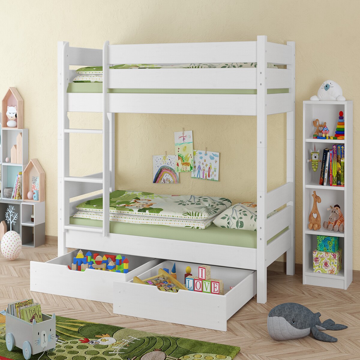 Etagenbett Kiefer weiß 90x200 Massivholzbett Kinderbett Zubehör wählbar V-60.10-09WRollrost. Matratzen und Doppelbettkasten inkl.