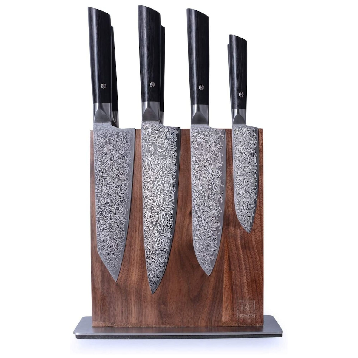 Zayiko magnetischer Messerblock aus edlem Nussbaumholz massiv mit Edelstahlsockel, ohne Messer, zweiseitig für bis zu 8 Messer