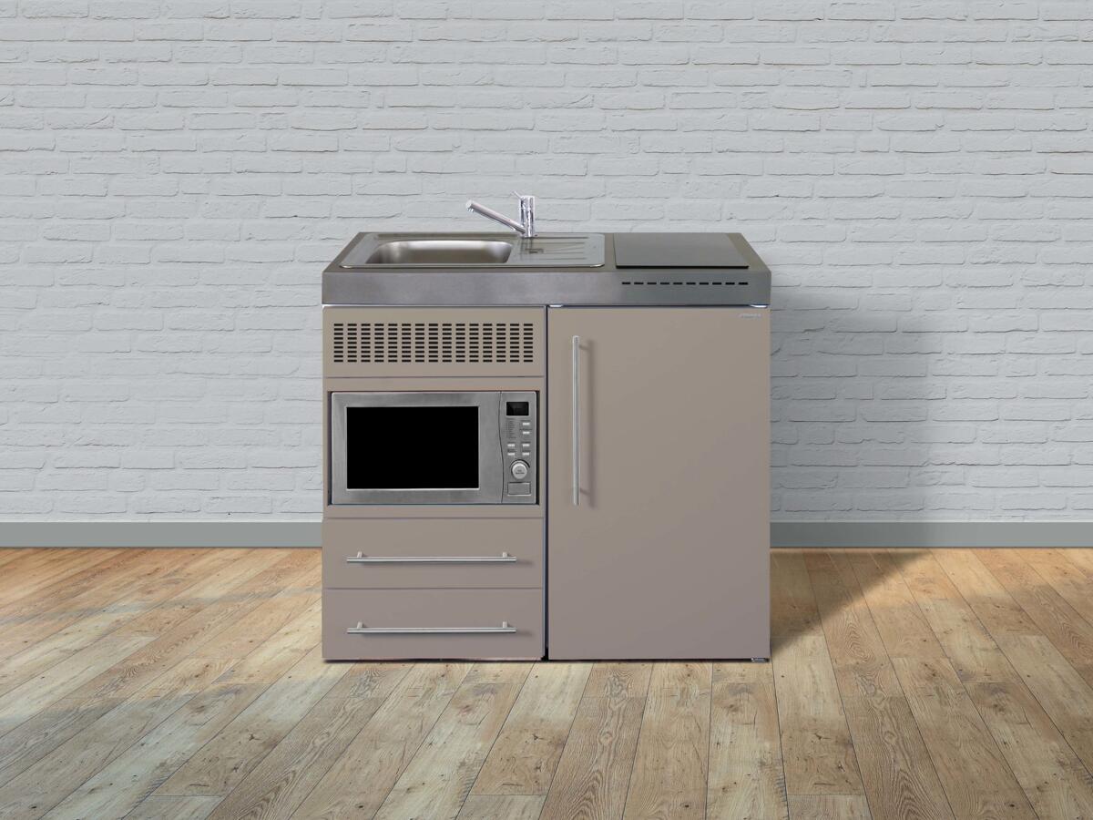 Stengel MPM 100 Miniküche, 100cm breit, Induktionskochfeld, Kühlschrank mit Gefrierfach, mit Mikrowelle, Spüle links, sand matt (10100 010681 11)