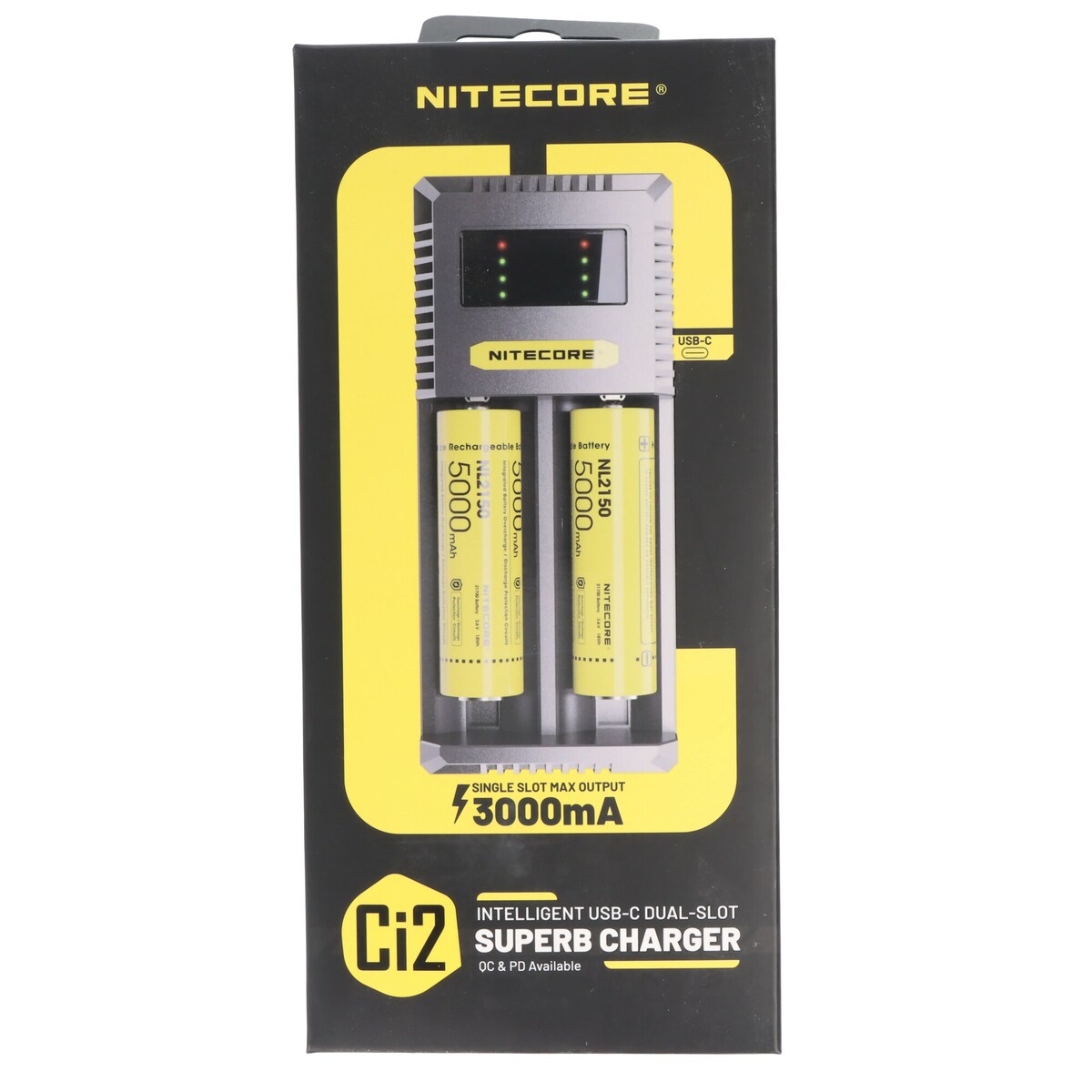 Nitecore Ladegerät CI2, intelligentes 2fach Schnell-Ladegerät mit USB-C Ladeport, lädt Li-Ion, NiMH und NiCd Akkus