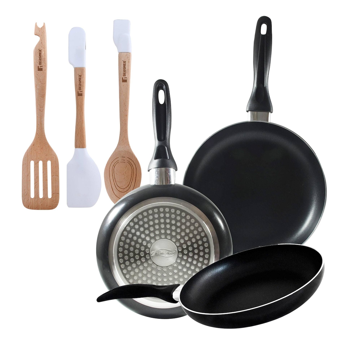 BERGNER - Set aus 3 gepressten Aluminium-Pfannen Ø16/Ø20/Ø24 cm, geeignet für Induktion Navy Black Set 3 Utensilien aus Silikon und Holz