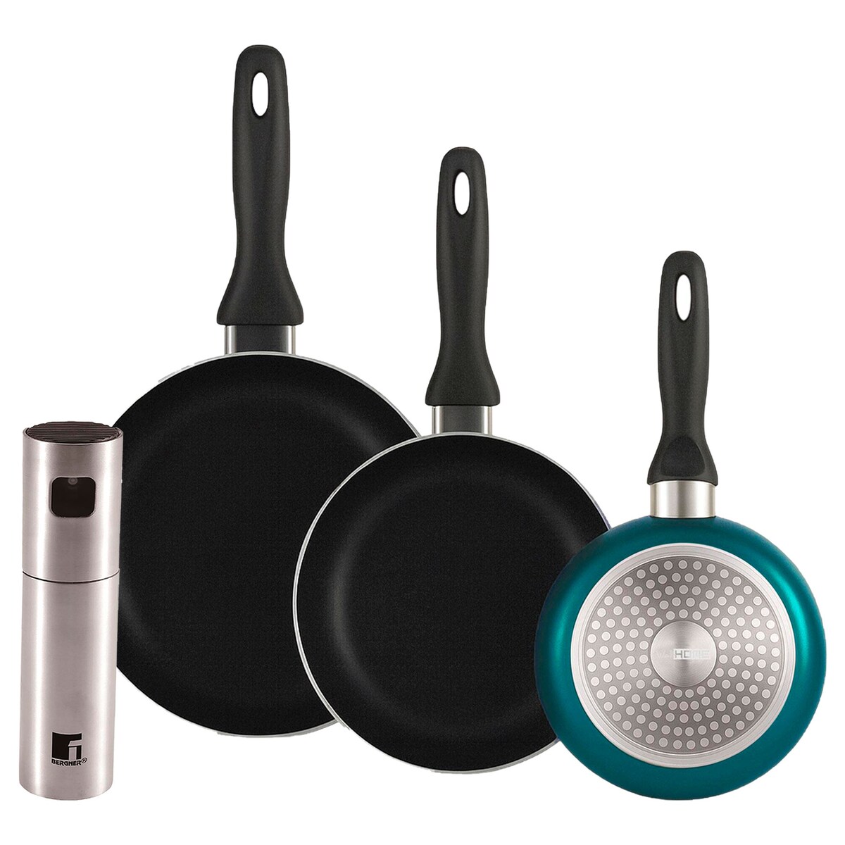 BERGNER - Set aus 3 Pfannen Ø16/20/24cm aus gepresstem Aluminium in metallic-blau mit Öl-/Essigsprüher Ø4x17,5 cm aus Edelstahl