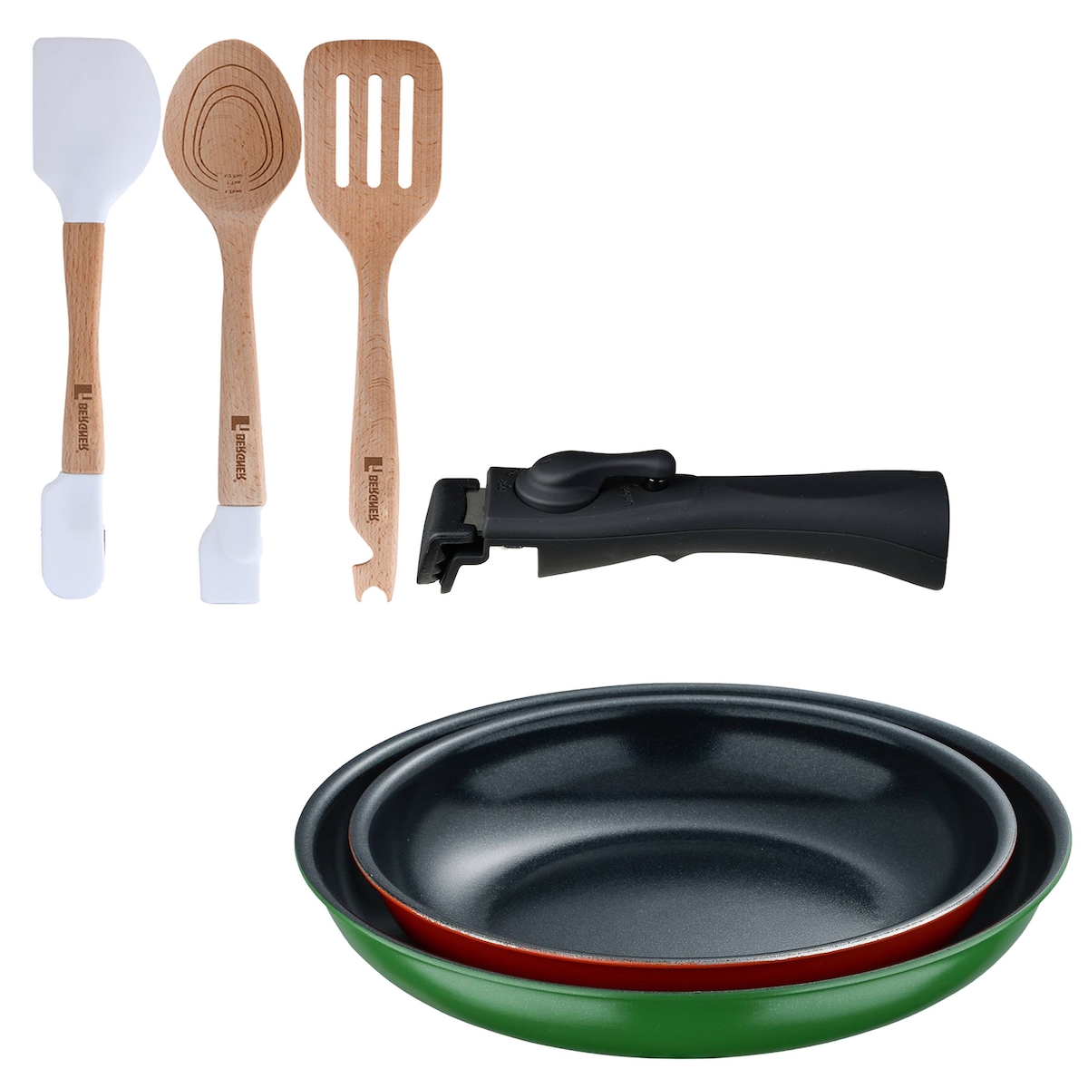 BERGNER - Set aus 2 Pfannen Ø22/26cm gepresstes Aluminium mit abnehmbarem Griff mit Set aus 3 Küchenutensilien aus Silikon und Holz