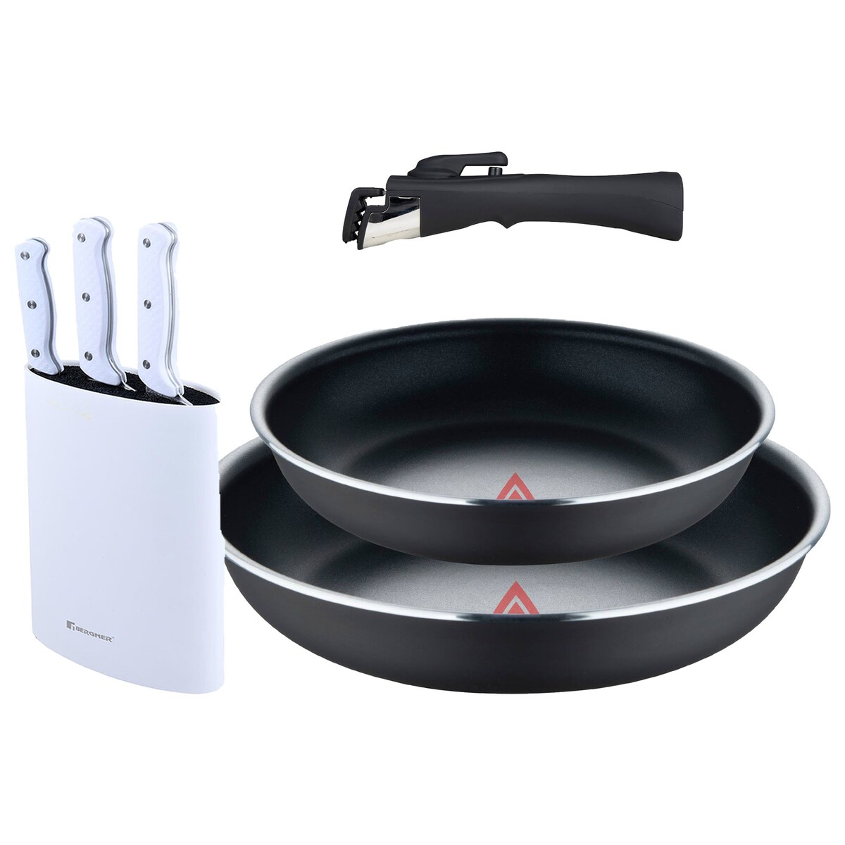 BERGNER - Set aus 2 Pfannen Ø24/28cm gepresstes Aluminium Antihaftbeschichtet mit abnehmbarem Griff mit Set aus 3 Edelstahlmessern mit magnetischer